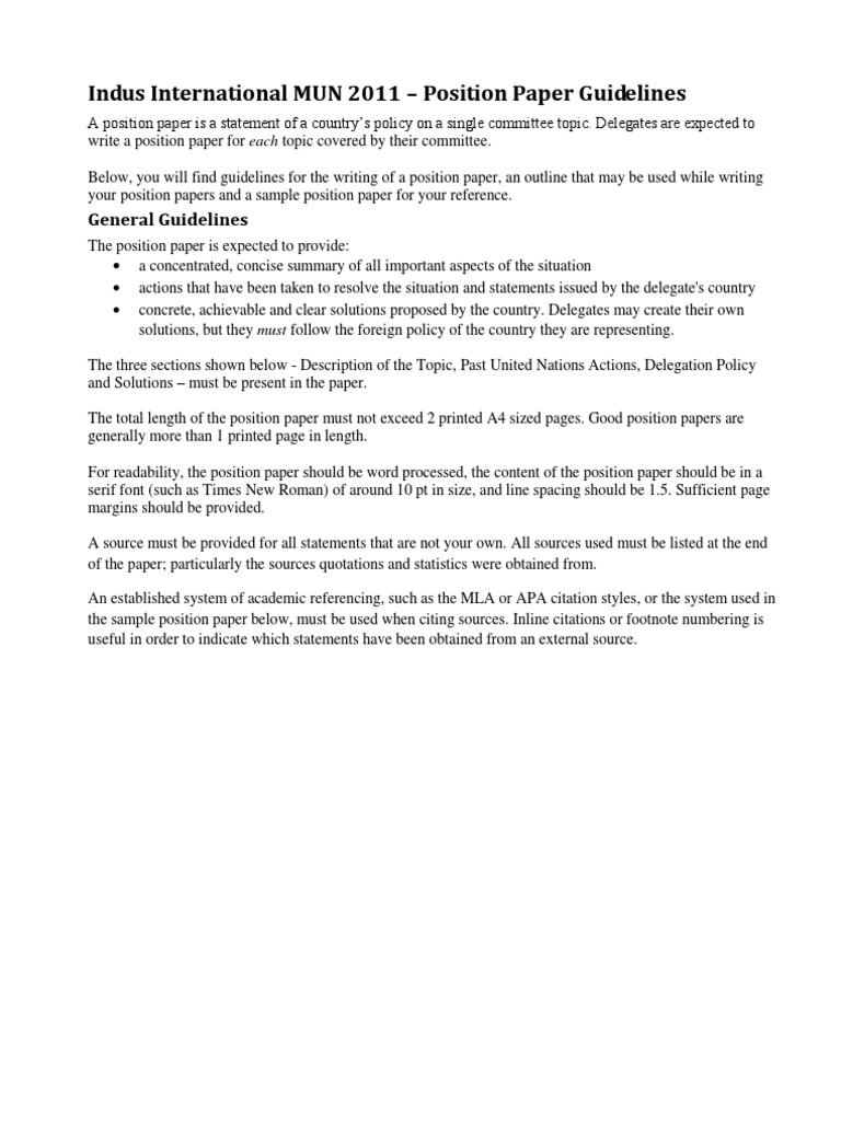 The general assembly question of: Only delegates who submit position papers before the conference begins are eligible for awards. Each paper must cite its resources. A good position paper should make clear reference to these guidelines and demonstrate that the students clearly comprehend the creative and compositional depth required for an mun simulation. A mun position paper, also known as policy paper, is a strategic document that gives an overview of a delegates country position.
